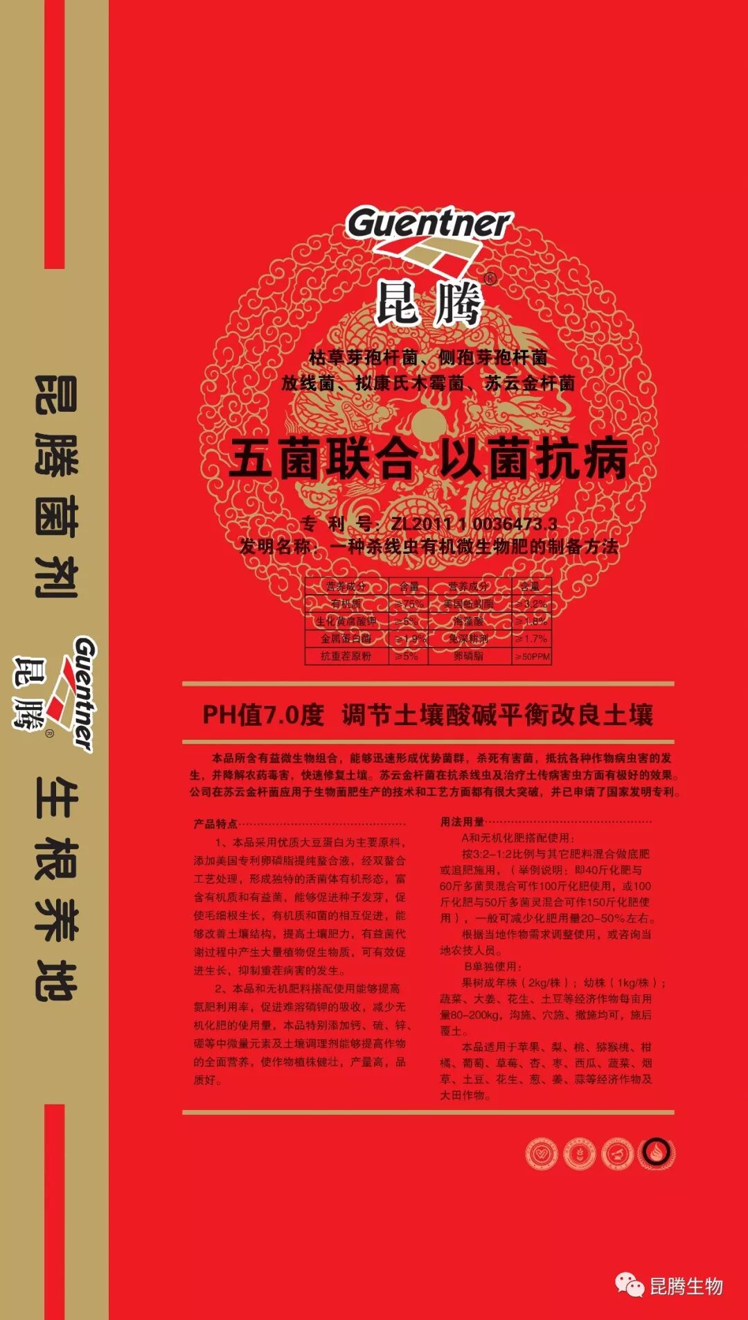 “昆腾”微生物菌剂可调节土壤酸碱度平衡,有效活菌数≥5亿/g,有机质≥75%,使得效果显著,特有的五菌联合,五种菌种有各自的功效,又相互作用,相互促进,能迅速形成优势菌群杀死有害菌,抵抗各种作物病虫害的发生,并降解农药毒害,快速修复土壤。氮细菌能有效固定土壤中的氮元素,使其不流失,有效提高氮肥利用率40%。磷细菌和钾细菌则分解土壤中长期积蓄的磷、钾元素,使农作物二次吸收利用,利用率分别提高30%和35%,从而降低无机肥的投入量。